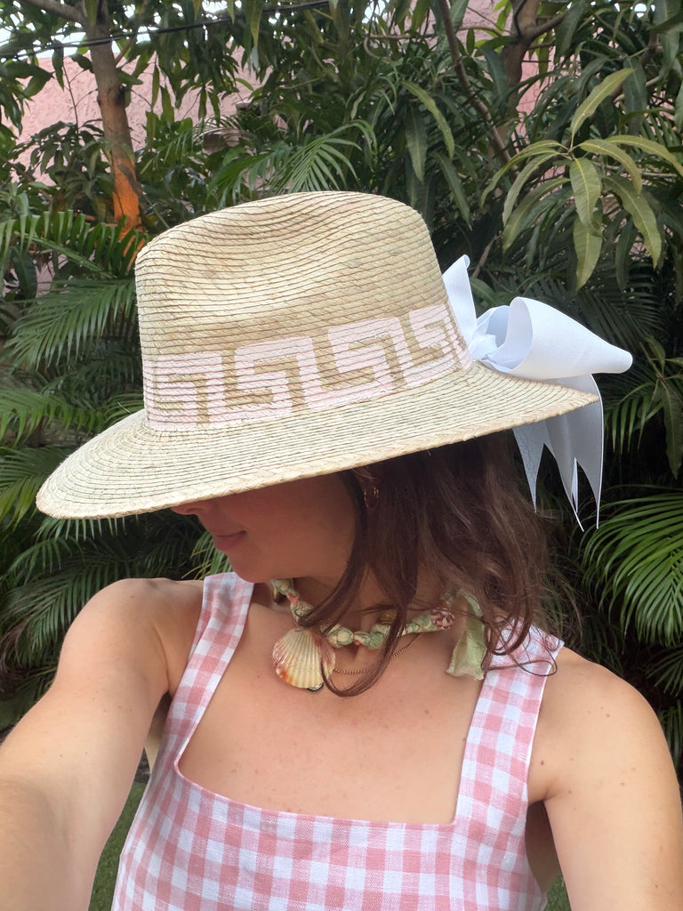 Emmie Ruth x SBB Orchid Hat - Hand-Painted Light Pink Greek Key with White Grosgrain Ribbon